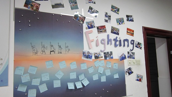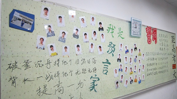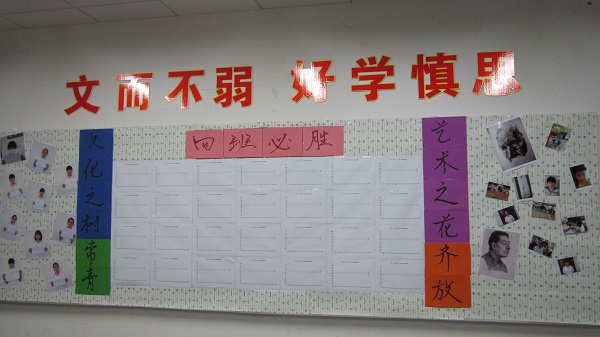 (本网讯) 开学伊始,高三便积极进入备战状态,将“班级文化建设”作为第一项学生激励工作。2013年9月1日晚,年级主任尹小红携全体班主任进入各班级进行班级文化建设评比。各班针对自己的实际情况,设计了独具特色的班级文化墙。其中许多创意更是令人耳目一新:竞争上游的“兄弟PK榜”、绚烂多彩的班级照片墙、简明实用的成长曲线图、整齐划一的书柜、振奋人心的目标榜、分区名明确的学习园地……学生自己设计的班级文化,既承载了他们的梦想,也表决了他们的坚定。高三开学伊始,年级组以这样一种别致的方式引领班级营造良好的学习氛围,旨在让学生直面高考,以最佳的状态迎接未来的挑战。