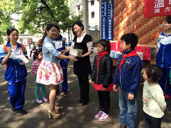 南苑社区是南方中学的社区服务基地,除了长期的志愿者服务活动外,还有三名南方中学教师在此长期义务支教。2014年3月29日上午,南方中学志愿者团队来到南苑社区。他们带着垃圾袋、拿着卫生工具,还搬来了4箱书籍。一个上午的时间,他们有的在社区拾捡垃圾,清除卫生死角;有的到了社区孤寡老人家里,陪他们聊天,为他们打扫卫生,做一些力所能及的小事;更多的志愿者则来到了社区服务中心,在这里,有一群小朋友在等待。他们迫不及待的围到桌子旁,急切的想要看看到底是些什么书。他们开心的讨论着,这几本我看过,这几本很有名。他们的脸上洋溢着灿烂的笑容。孩子们的年龄有大有小,当志愿者们把书交给他们时,他们都会敬一个标准的队礼,然后说上一声“谢谢!”。社区服务中心的负责人介绍到:这里有一个阅览室,但是很小,书也不是很多、类型不是很全。现有的那些书都是妇联捐来的。这次南方中学捐书很有意义。