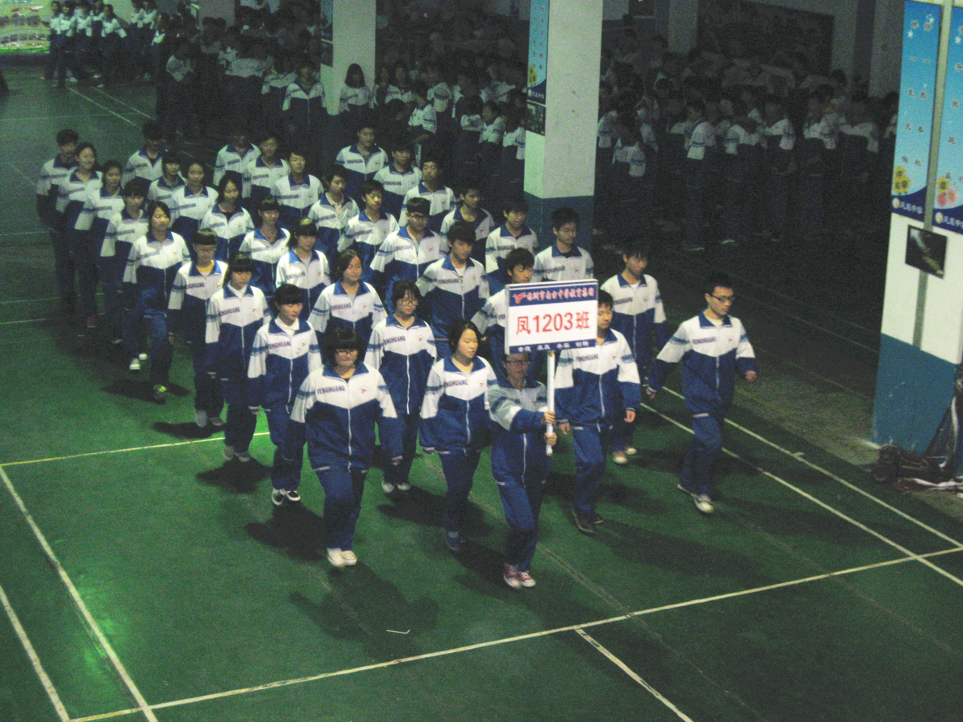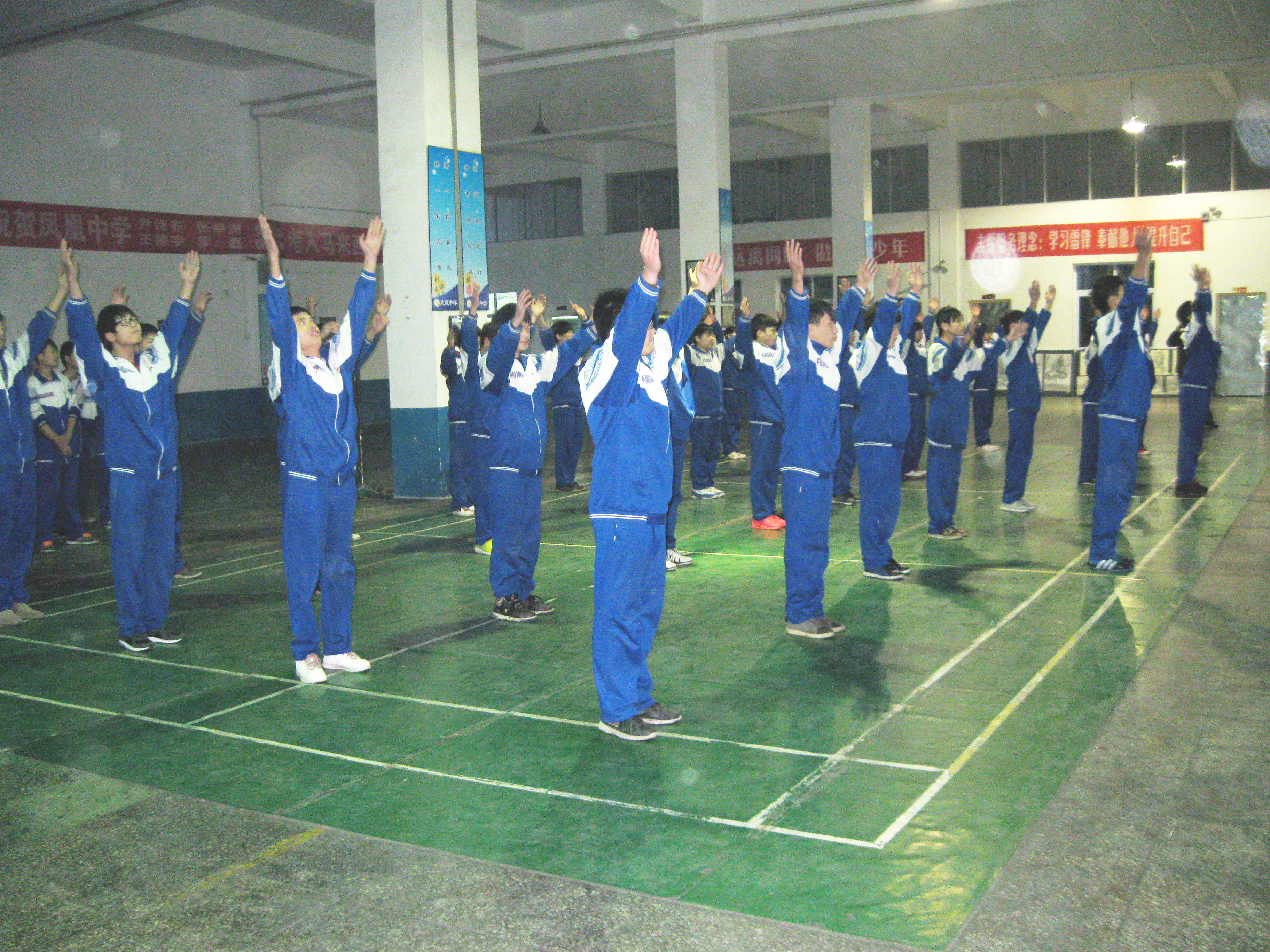 为了提高健康第一的思想意识,培养班级集体荣誉感和学生的综合素质,凤凰中学高一、高二两个年级于2013年12月12日利用第八节课在教学楼大厅举行了第一届学生广播操比赛。