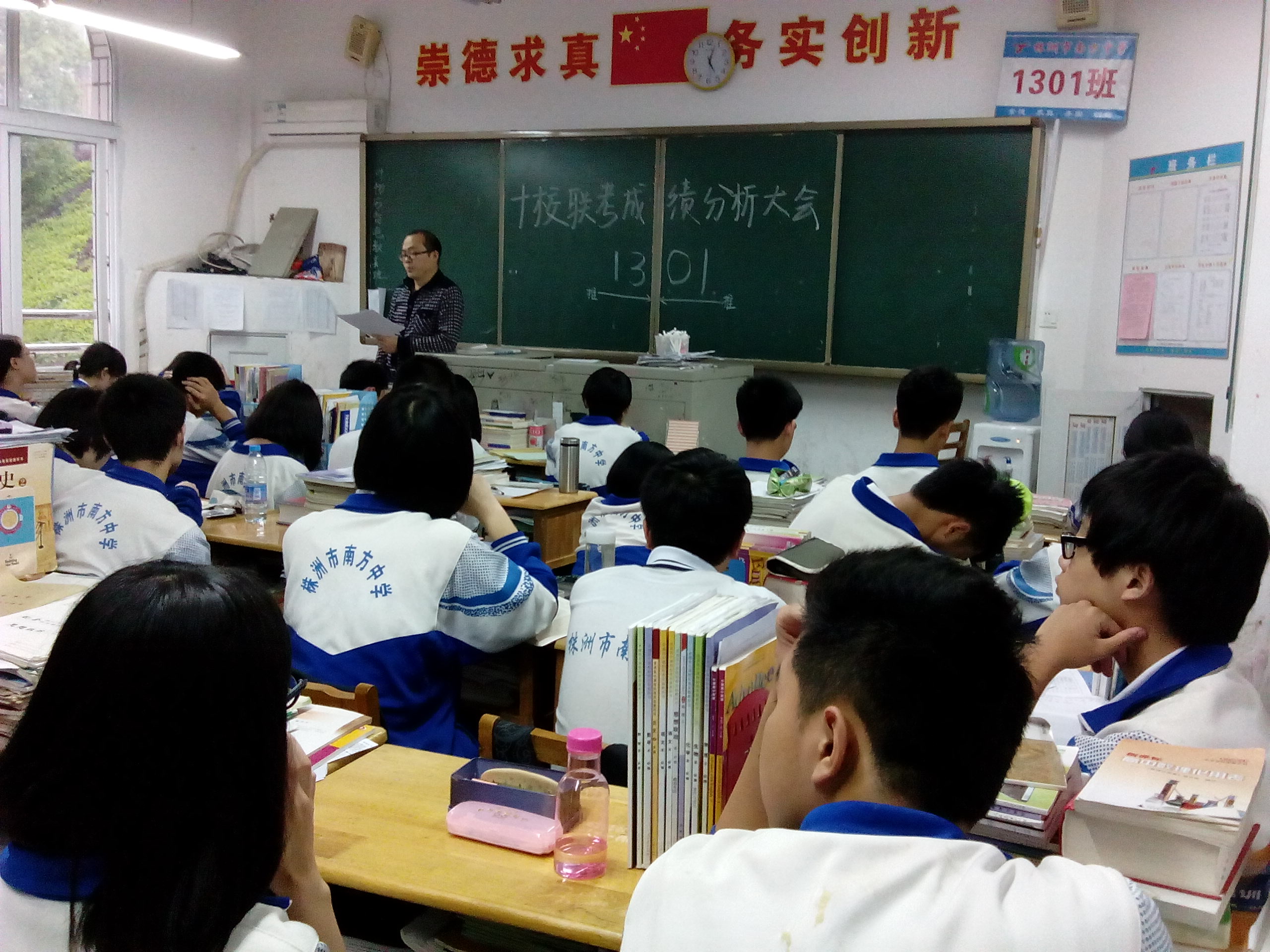 会议由各班班主任主持召开,主要从各科考试的相关数据,班级各科平均分的排名,各分数段班级的人数以及跟前一次月考的比较,看看自己的班级是进步还是退步等情况进行说明。面对这些数据,学生心里就有一杆秤,知道自己在年级的大概位置,以便激励他们努力向上。同时,对后阶段的学习和纪律,各班班主任还做了具体的要求。