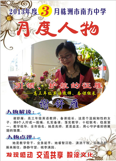 人物解读:谢舒雁,高三年级英语教师、备课组长。这是个温婉知性的女子,将6个人拧成一股绳,扎实备课,落实教学。十校联考,稳居第一;教学视导,全市扬名。她是良师,更是益友,用心守护着即将展翅的雏鹰。