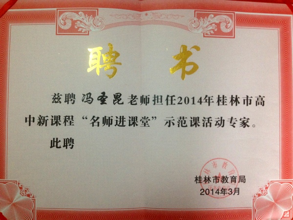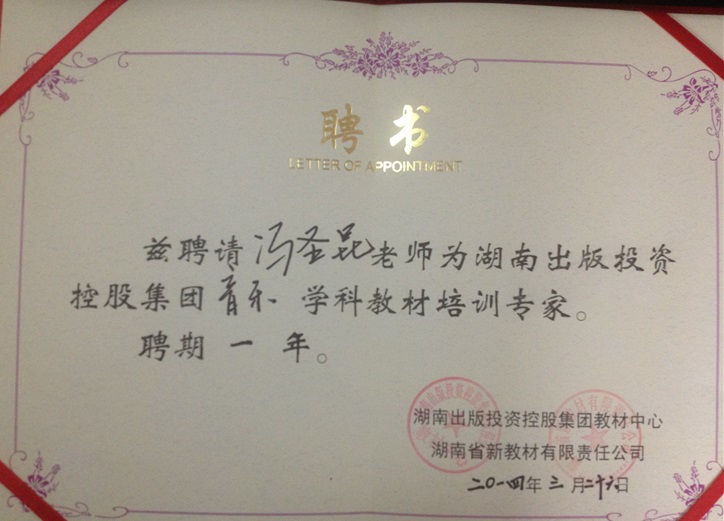 在此次活动结束后,冯圣坤老师被聘为湖南出版投资控股集团音乐学科教材培训专家,同时被桂林市教育局特聘为桂林市高中新课程“名师进课堂”示范课活动专家。