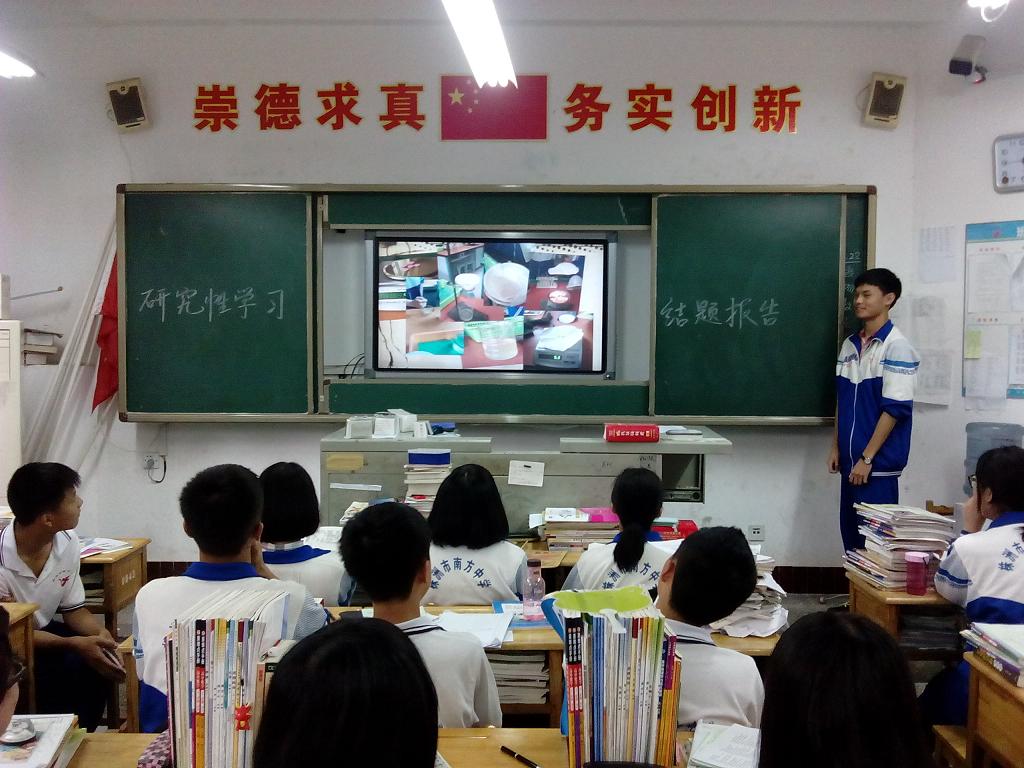 (本网讯:)今天下午第八节课,高一年级所在教学楼不时传来阵阵掌声。原来,经过几个月的调查研究,高一年级的全体学生正在以班为单位举行研究性学习结题活动。他们以研究小组为单位,运用精心制作的演示PPT,由小组负责人登台向同学们和老师展示自己几个月来的辛勤研究成果,课题指导小组的老师则时而不时提出问题,并现场给同学们的研究性学习结题打分。整个活动持续了一个多小时。各班班主任最后总结发言,对学生前期所做的大量工作给予充分的肯定,希望同学们能再接再厉,研究出更优秀的成果!