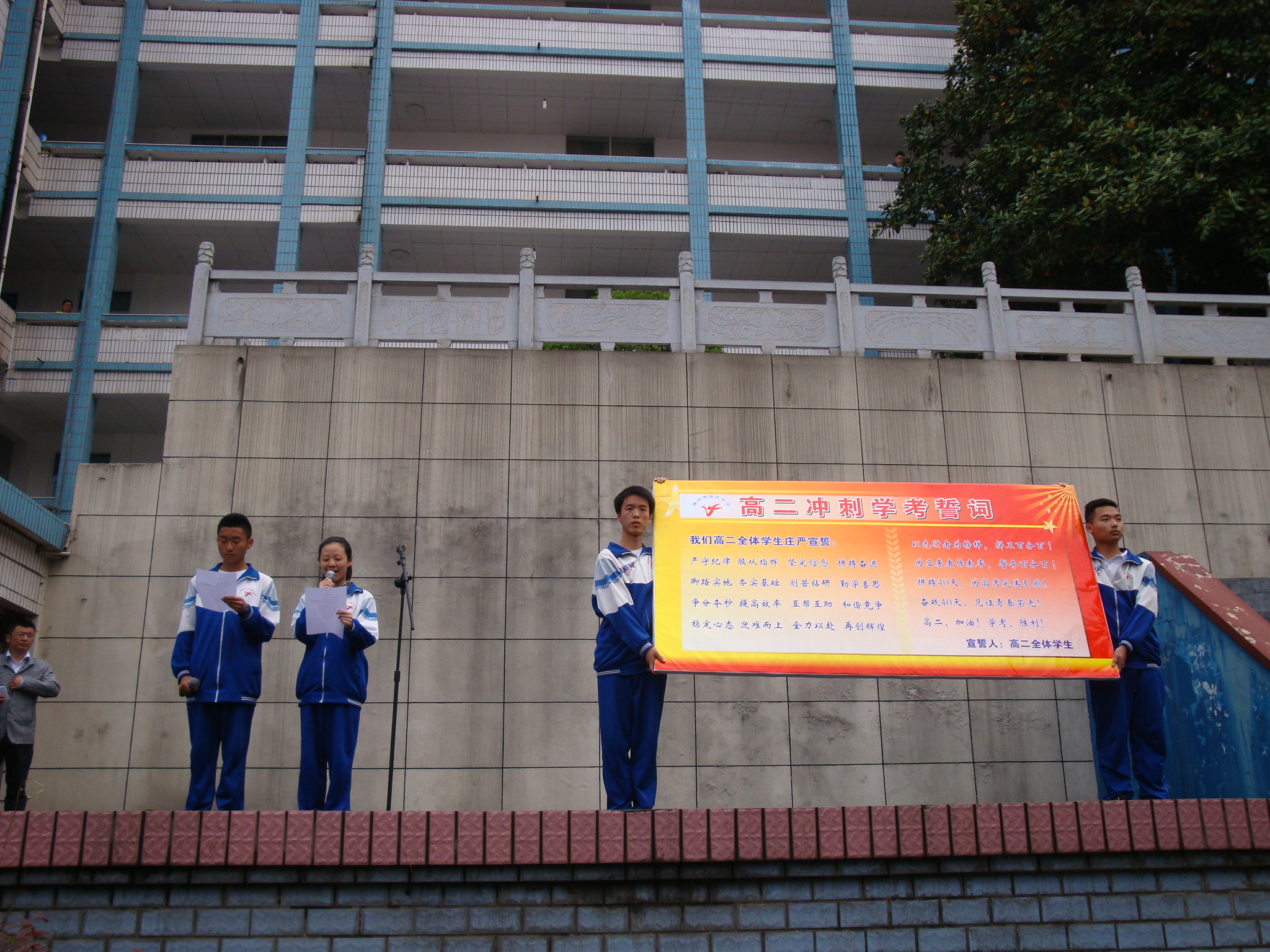 这次动员大会由教务科科长周一平老师主持。学校陈其北校长在会上讲明了学考的重要性,并且对全体高二学生提出了学考合格率达到100%,各科人均分达到90分以上和总分880分以上的学生人数超过60人的要求。随后高二全体师生在高一、高三年级学生的见证下,进行了学考宣誓。