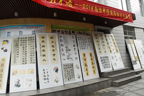 这一期成立于2013年下学期的南方中学书法班,在学生中大受欢迎。开班海报张贴没多久,就收到了很多学生的报名。书法班正式开班以来,同学们从最初的新鲜好奇,到“老老实实”练执笔姿势,在宣纸上写下“点”横“竖”“撇”“捺”,用稚嫩的笔触初探中华民族博大精深的文化。经过一个学期的学习,大家的书写水平都大有进步,于是,在2014年春季开学之初,师生共同策划了这次展示同学们初步艺术成果的展览。在南方中学学生科副科长邓必为老师看来,这个展览是师生共同努力不辍练习的见证,展示了拼搏进取的精神,有朝气,有韧劲,而选择在新学年开学的这个时候展出,含有“万马奔腾”而来的寓意,也是传达一种正能量。