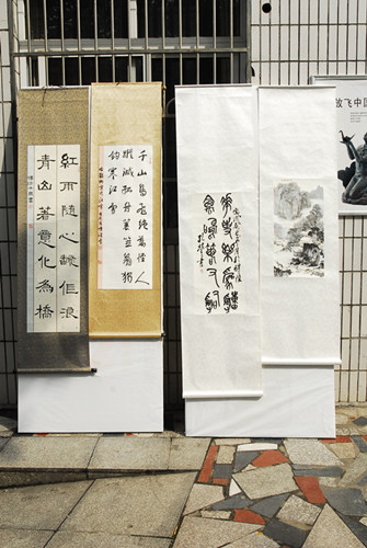 在学校科教楼前,几十幅学生书法作品一字排开,隶体的楹联,楷体的唐诗,行体的哲言,或流畅爽利,或端庄持重,或以形表意,笔锋盈转间流露韵味,一股淡淡墨香在空气中静静流淌,引得来往的师生纷纷驻足品赏。