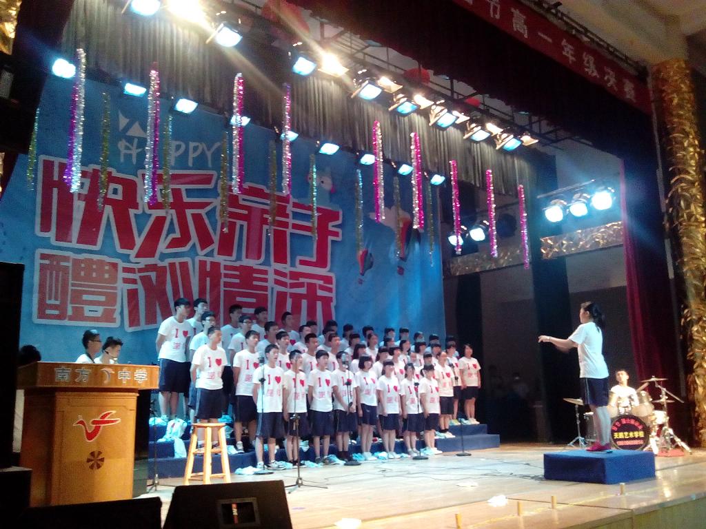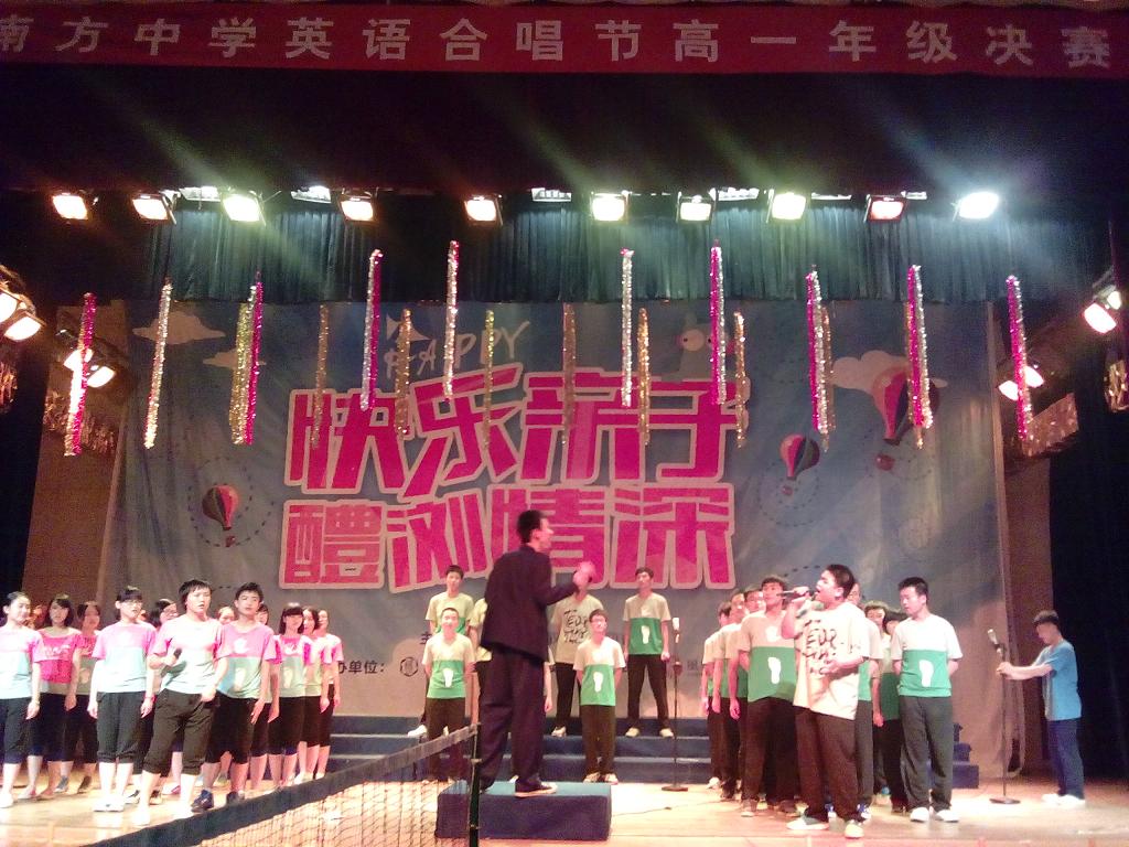 (本网讯:)为了丰富学生的校园生活,营造校园英语特色的氛围,培养学生的音乐素养,激发学生学习英语的兴趣,展示班级风采,高一年级于六月四号晚七点在南方中学艺体管举行英文歌曲合唱比赛。经过初赛选拔,1306班等八个班级顺利晋级决赛。为了确保比赛的公平公正,比赛除邀请高一英语组部分老师担任评委,还邀请了校工会主席曾四喜先生、艺体科江和平女士、英语学科基地负责人刘正芳老师、音乐组教师韩乔、国际合作部外籍教师和十位学生一起担任此次决赛的评委。