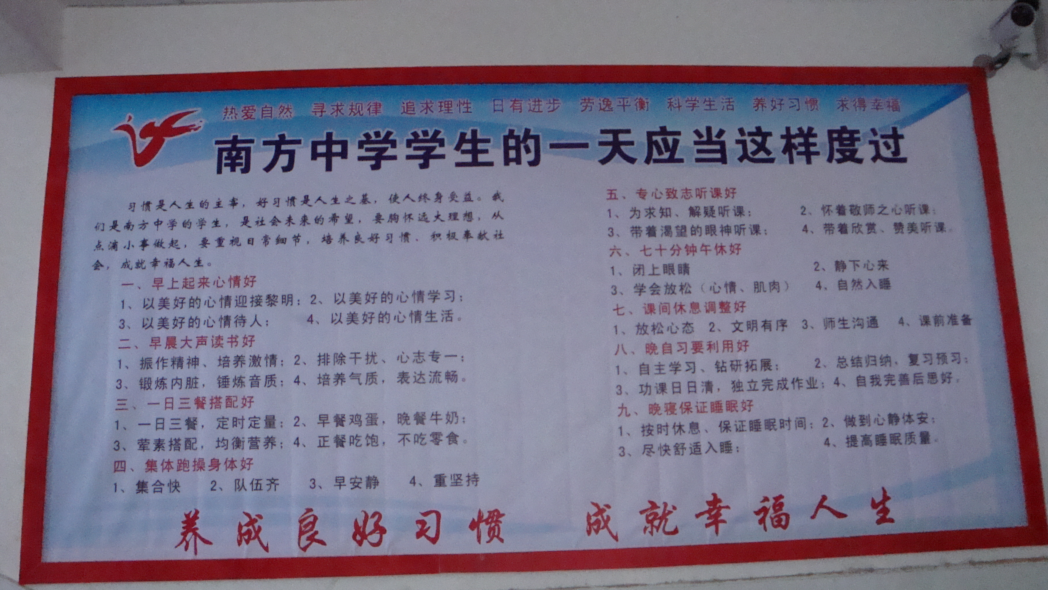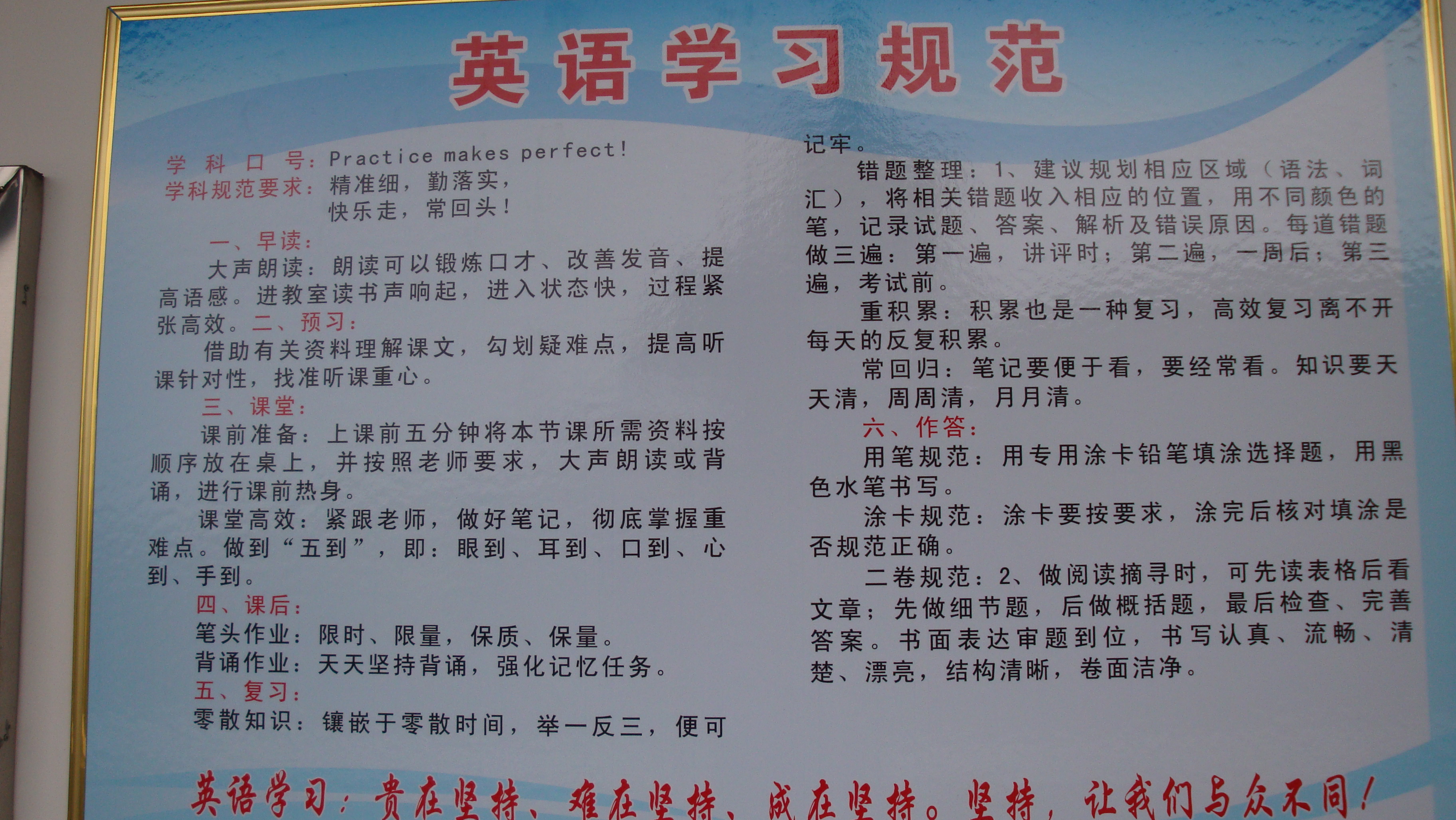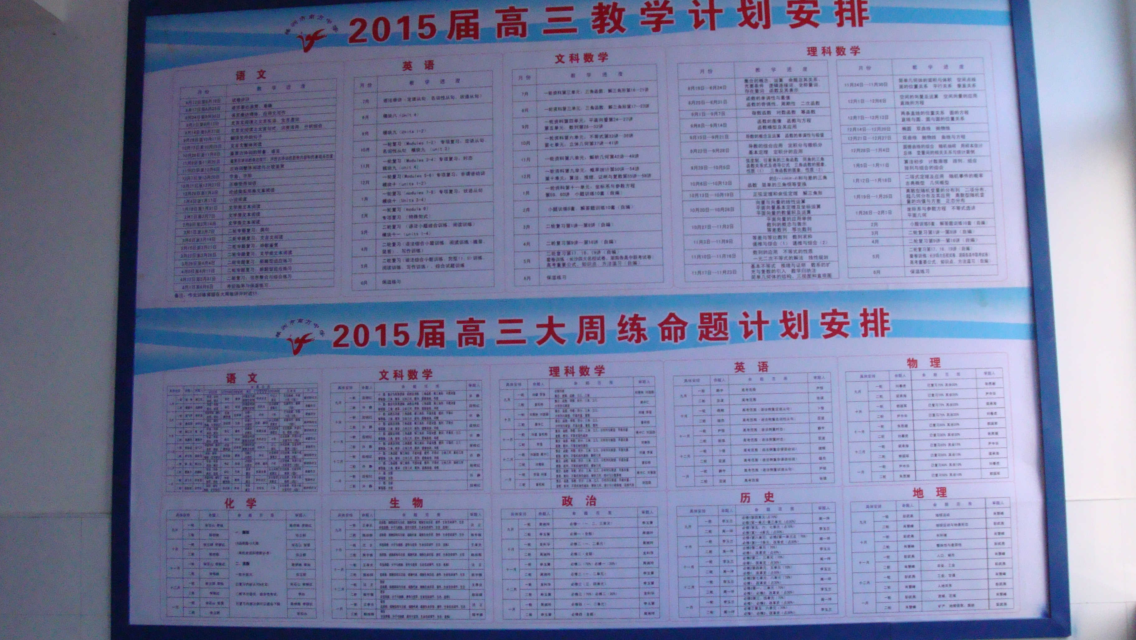 学生进入高三的第一天,他们就发现走廊的墙上就有了各科的教学进度表,各学科学习方法和要求栏。在高三办公室外面的墙上装贴了高三学生的日常行为规范。学生们都说有了这些,他们的学习更具体,他们自己的计划更有针对性。