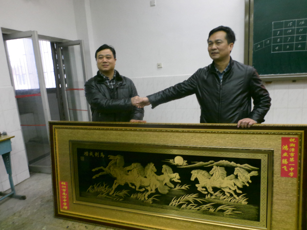 图为:夏校长代表南中向湘潭一中赠送礼物