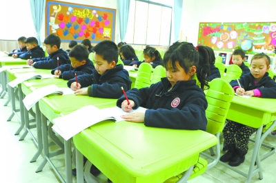 衡阳市成章小学(雁栖湖校区)学生在上毛笔字课