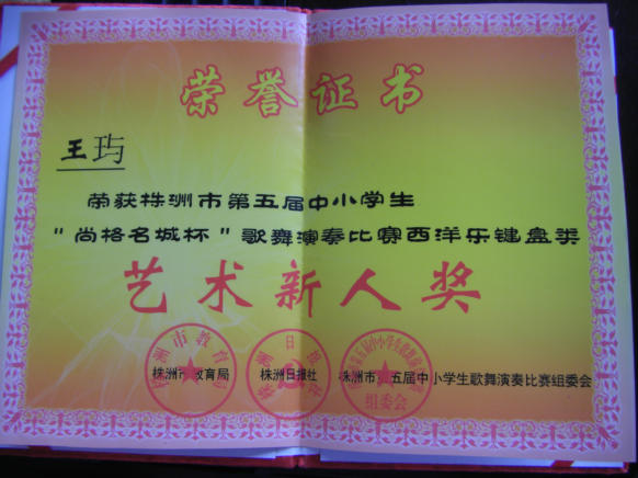 王玙 歌舞演奏比赛西洋乐键盘类艺术新人奖