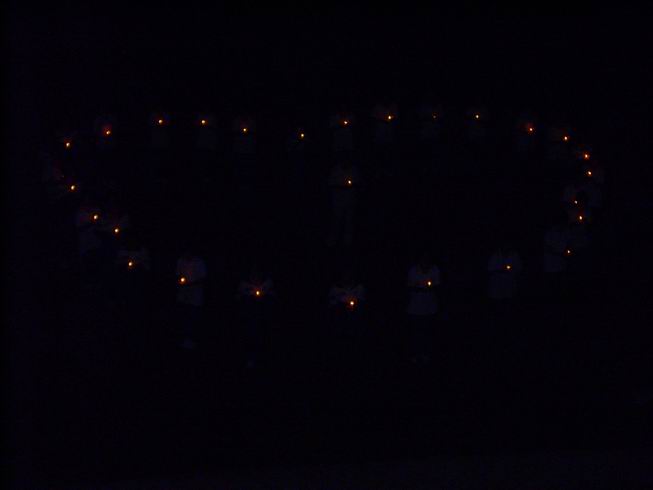 晚20:20分,校园广播里响起了《感恩的心》的音乐,教室内的师生纷纷来到走廊上,操场的升旗台处,高三学生会的成员们手捧红烛围成心形,全体学生和着音乐唱起歌曲,场面温馨、感动。