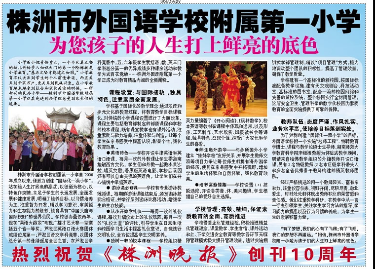 株洲市外国语学校附属第一小学自2008年成立以来,便致力创建 “国际化一流小学”:站在给人生打底色的高度,以创新为核心,以特色作突破,立足于学生的长远发展、全面发展和健康发展,明确了培养目标:以习惯培养为主,注重智力开发,辅以学习意识、审美能力和生存能力的培养,培育具有“中国头脑与国际视野”的世界公民。学校创办虽仅两年,但在“英语大赢家”电视广播才艺大赛一举囊括五个省一等奖;芦淞区英语口语大赛团体成绩位居第一;芦淞区语文学科竞赛,以团体总分第一的佳绩遥居全区之首;在芦淞区学科竞赛中,五、六年级学生囊括语、数、英三门学科总分第一的优异成绩多种课余活动和教学方式百花竞放……株洲外国语附属第一小学正成为对教育精品内涵的全新阐释。