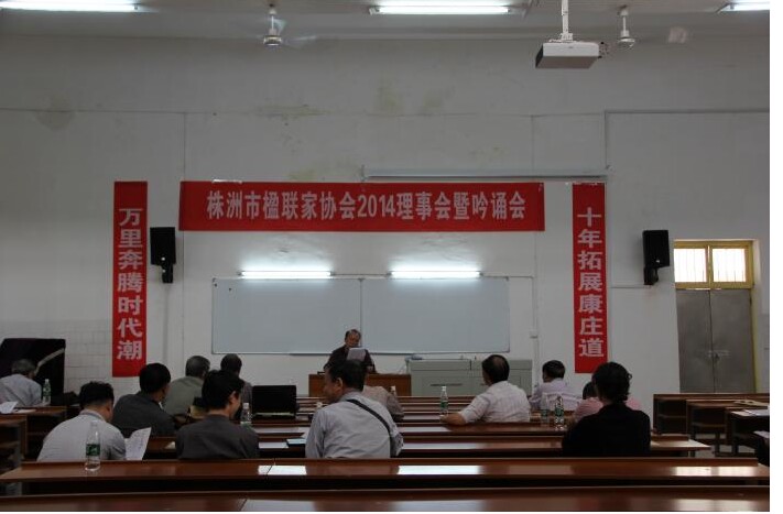 (本网讯)10月25日下午,株州市楹联家协会常务副主席、南方中学高二语文老师左建军在湖南工业大学会议室为来自株洲五县一市的楹联家代表传达习近平主席关于文艺工作的重要讲话精神,强调文艺工作是塑造人类灵魂的伟大事业。文艺创作需要传递正能量,体现人民性。楹联家们应多出作品,多出好作品,服务人民。次日和楹联家们一起去时代驾校采风,并亲自为时代驾校创作了“十年拓展康庄道,万里奔腾时代潮”的楹联作品,楹联由株洲青年书协主席蒋斌书写,作为礼品赠与时代驾校。