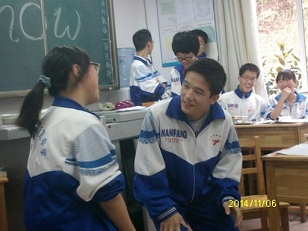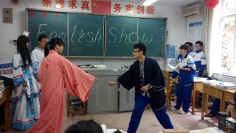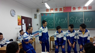 (本网讯)11月6日上午第1、2节英语课,高二年级1308班举行了英语剧的分组表演,表演者为全班学生,评委是英语老师宫尚琴老师与外教Magen女士,主持人是刘畅和王阳宇同学。本次英语剧表演在两周前就已分配任务,刚开始同学们都有为难情绪,觉得做不好,但经过半个月的精心准备,同学们奉献出一出出富有哲理的童话剧,生动感人的漫画改编剧,令人捧腹的喜剧。演出中间,每一组都准备了道具,有一个组甚至为此次表演准备了戏服。六个组的表演各具特色,绝无重复。整堂表演气氛活跃,人人乐在其中。外教Magen女士做了精彩的点评,她说,同学们在这么短的时间内能够自编自导自演出六出课本剧,实为难得,潜力无限。