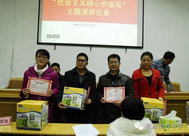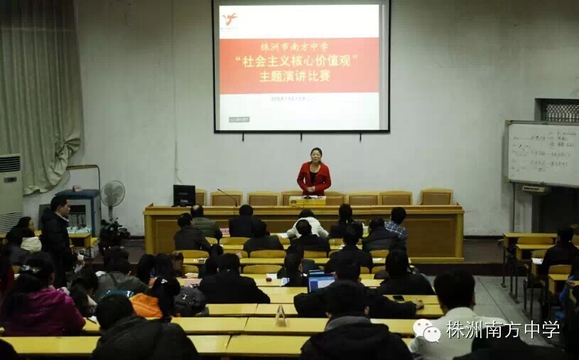 12月14日,南方中学组织全体党员开展了以“社会主义核心价值观”为主题的演讲比赛。12名选手分别就“富强、民主、文明、和谐、自由、平等、公正、法治、爱国、敬业、诚信、友善”12个词结合自己生活工作的实际进行了阐释。校党委成员和学术专业委员会委员担任评委,根据得分高低评出了四个一等奖、四个二等奖、四个三等奖。党委书记林喜元宣读了获奖名单,夏立威校长为参赛者颁发了奖品。