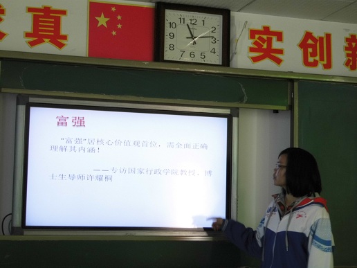 经过长期的实验和准备,我校高二年级寻找到了课前演讲这一方式。在政治课前,挪出5分钟左右的时间给学生进行演讲。每个班将学生分为若干小组,每组承担一个内容,从小组分工、提炼选材、课件制作、演讲稿修改全部由学生自己完成。最终呈现为政治课前仅仅5分钟的演讲。这一形式经过长期的实践,几经修改调整,终于定型,在2015年到来之际,政治课前演讲将变为一个成熟的固定的环节长期存在在南中高二的课堂之中。