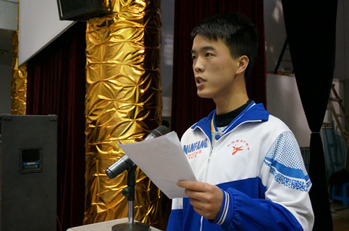 随后,1304班林江,1214班周大林作为学生代表发表了讲话,积极响应夏校长的号召,激情洋溢的表达了对即将到来的学考和高考必胜的信念。