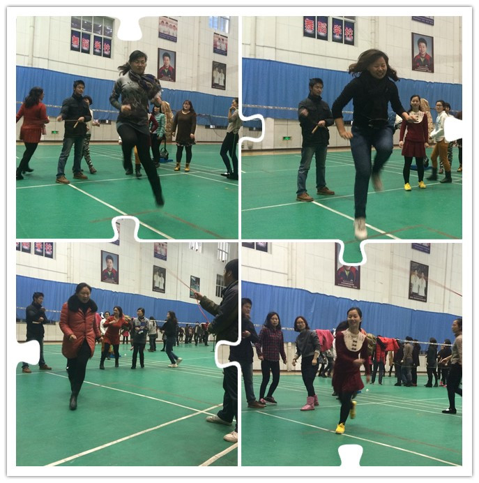 比赛分为集体长绳和个人短绳。高一年级女老师们很早被动员起来,当天上午课间操就抓紧时间练习,尽管下过雨地上的水渍没有干透,尽管大部分老师没来得及换鞋,还穿着一双高跟鞋,也越跳越来劲。