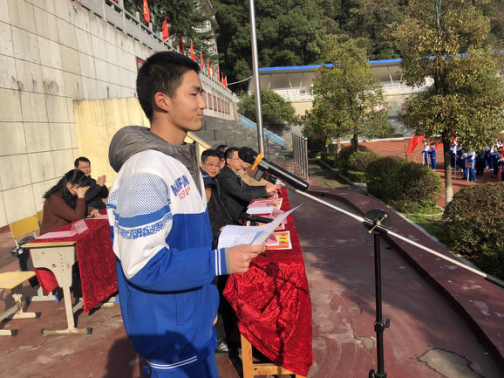 1510班李世龙作为高三学生代表发言。作为即将完成高中学业的高三学子,他与学弟学妹们分享了“天道酬勤”的信念,同时表达了全体高三学生面临高考的紧迫感和奋进的力量,“我们今日扬帆起航,六月注定灿烂辉煌”。