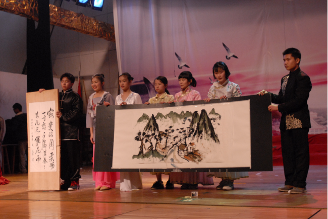 高一1706和1708两个班级合作的《念》,将书画与舞台融为一体,舞台左右分别是现场挥毫写字、作画的同学们,短短几分钟的舞台结束,小书法家和小画家们将各自的作品展现出来,诗情画意令人叫绝;
