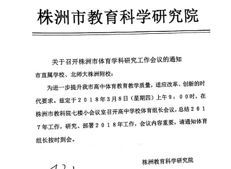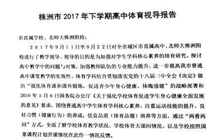 在3月8日株洲市教育科学研究院举行的全市高中体育组长会议中,教科院领导就2017年下学期的教学视导做总结。为进一步提升我市的高中体育教学质量,加强提升体育教师的专业能力,探讨了高中教学中的问题与对策,目的是为加强对学生学科核心素养的培养研究,进一步提高我市高中课堂教学的时效性,促进青少年身心健康,以适应改革创新的时代要求。通过“两看两问” 的方式,全面了解各校的体育教学状况,学校体育大课间的情况,。