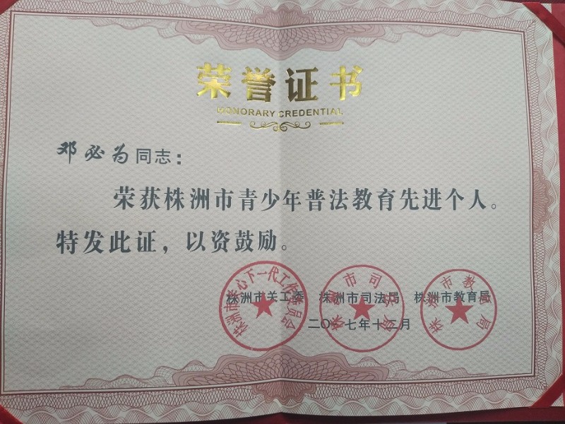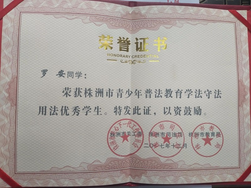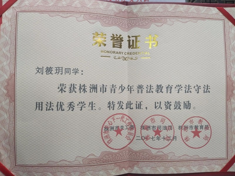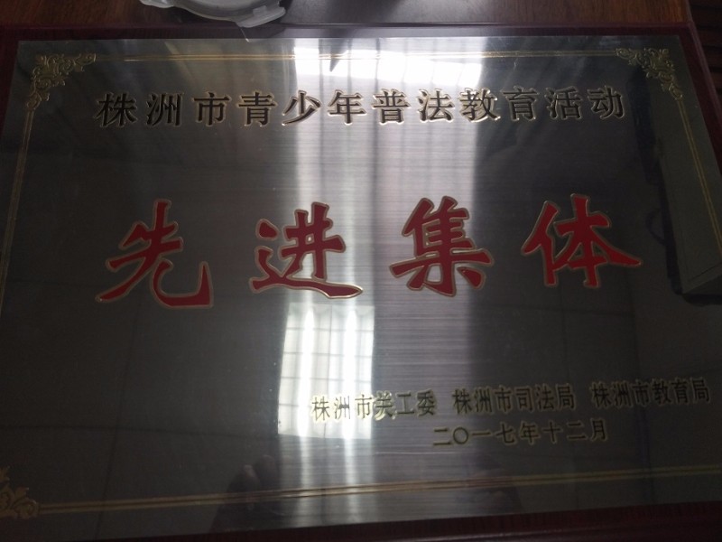 活动轰轰烈烈的开展,使全体师生的法律意识不断加强,全校初步形成了知法、懂法、守法的良好氛围,2017年,我校师生违法率为0。由于普法系列活动的有序开展,我校得到了株洲市关工委、司法局、教育局通报表扬。我校被评为青少年普法教育优秀集体,邓必为老师被评为普法教育先进个人,罗安、刘筱玥同学被评为学法守法用法优秀学生。