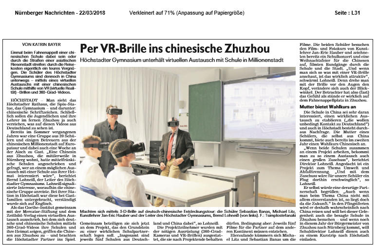 3月22日,南方中学和德国霍希斯特文理中学共同进行的“360度虚拟全景视频”交换项目同时登上了德国纽伦堡市(Nürnberg)和霍希斯特市(H?chstadt)的报纸。自2017年7月我校2名老师带领20名学生对霍希斯特文理中学进行访问以来,我校和霍希斯特文理中学一直保持着紧密的联系,并且共同参与了歌德学院的各类活动。