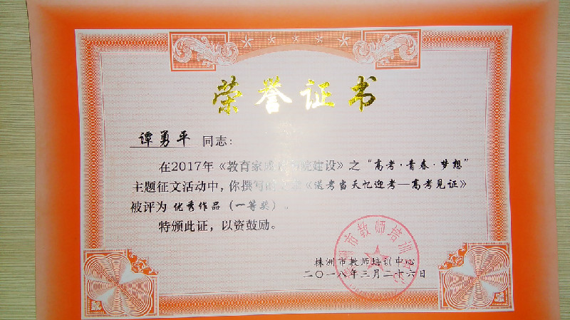 接在“清风株洲”等征文活动中屡次斩获一等奖之后,谭老师参加了“教育家成长书院建设”之“高考青春梦想”主题征文活动,他撰写的“送考当天忆迎考——高考见证”又获得了优秀作品一等奖,称为名副其实的一等奖专业户。