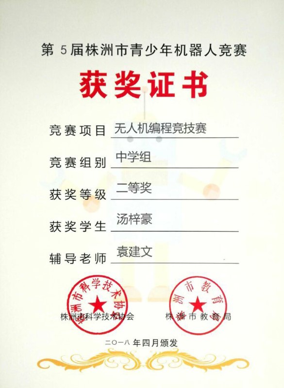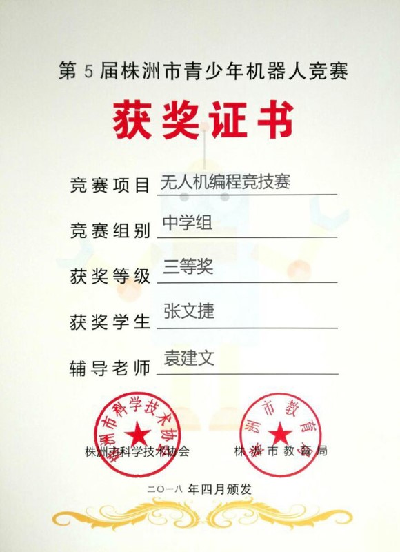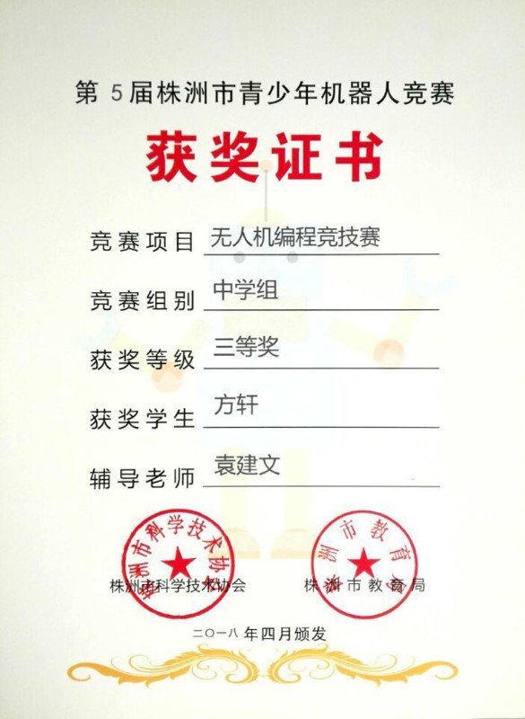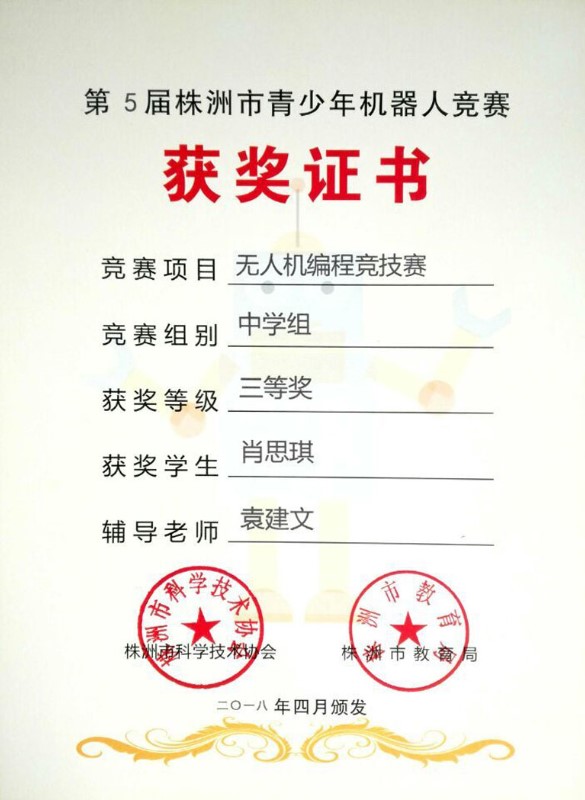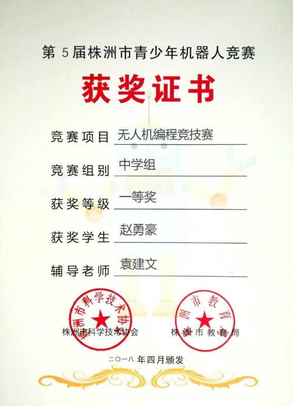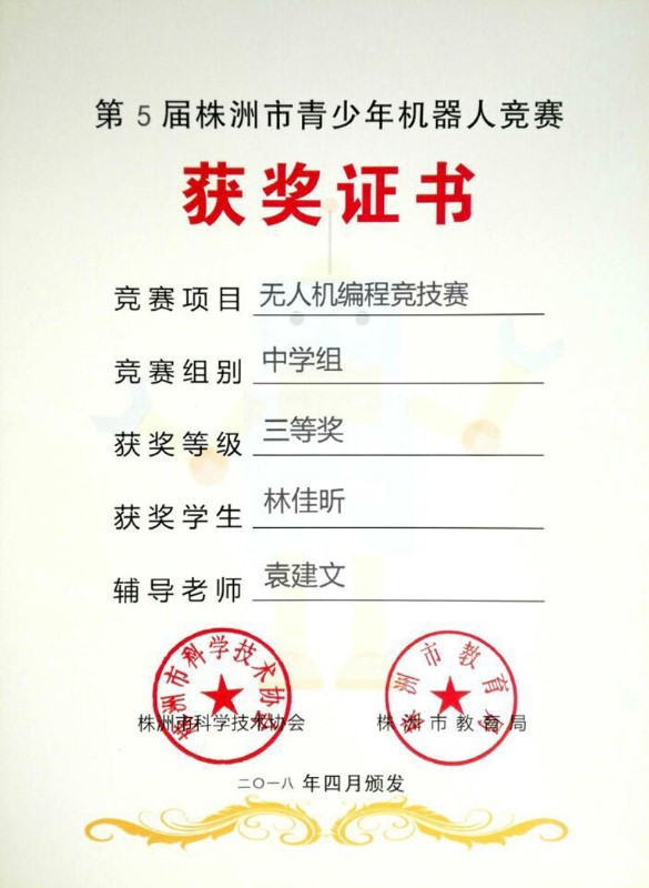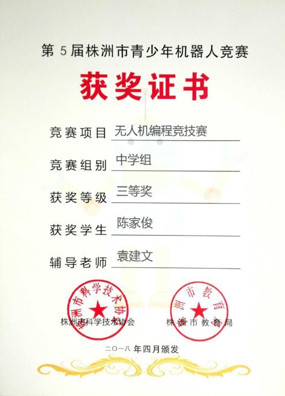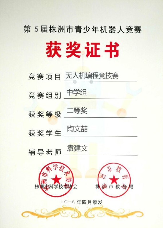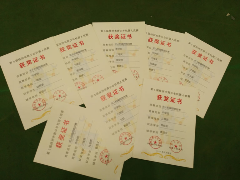 在叶欣副校长的亲自授课和组织下,我校航模队在刚刚结束的“第5届株洲市青少年机器人竞赛”中再创辉煌。在“无人机编程竞技赛中”,拿到了1个市壹等奖、2个市贰等奖,5个市叁等奖的好成绩。其中高一年级赵勇豪同学以100分满分的成绩荣获市壹等奖,直接晋级省赛。高二年级汤梓豪总分也是100分满分,但是因为时间方面略微慢点荣获市贰等奖。只训练了一个星期的陶文喆、肖思琪、林佳昕三位同学,通过自己的刻苦训练,分别以93分、92分和89分的成绩分别荣获市贰等奖、市叁等奖。