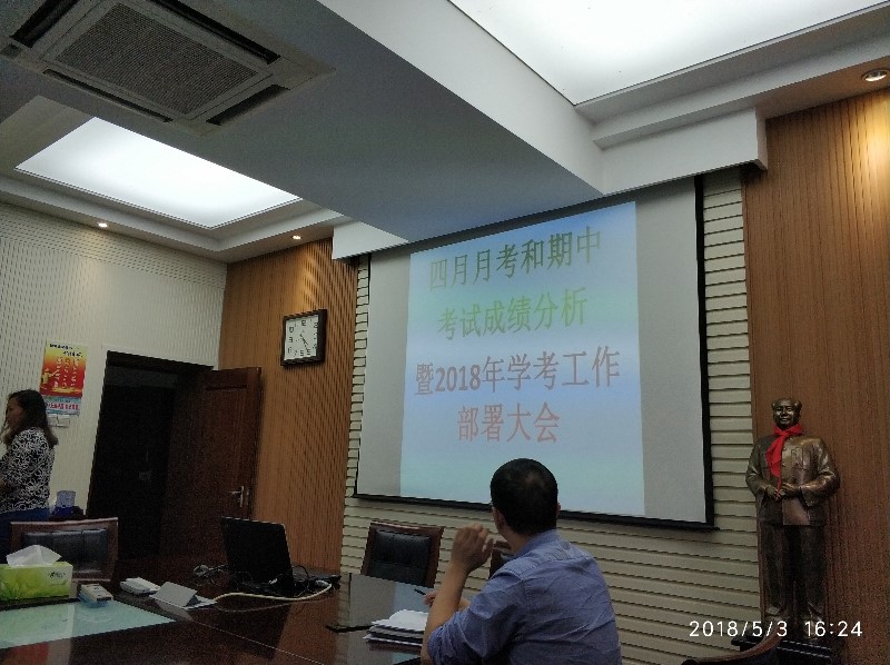 5月3日第八九节,高二全体老师在科教楼会议室召开月考和期中成绩分析暨学考工作部署大会,会议由吴新民主任主持,米仁金校长、谭志中副校长、教务科周一坪科长出席会议并讲话指导。