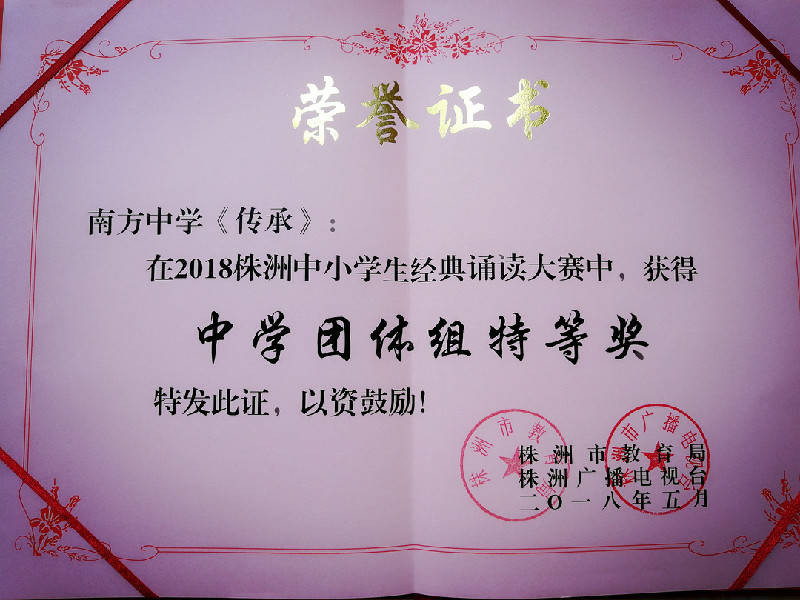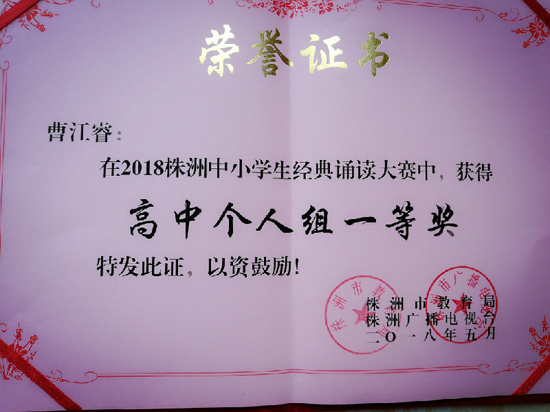 在株洲市教育局和市广播电视台开展的“2018年株洲市中小学经典诵读大赛”中,由我校高一年级1709班和1706班组成的50人参赛队在4月21日的团体赛决赛中,以全场最高分夺得团体赛特等奖;在4月22日的个人赛决赛中,1709班曹江睿同学荣获个人赛一等奖。