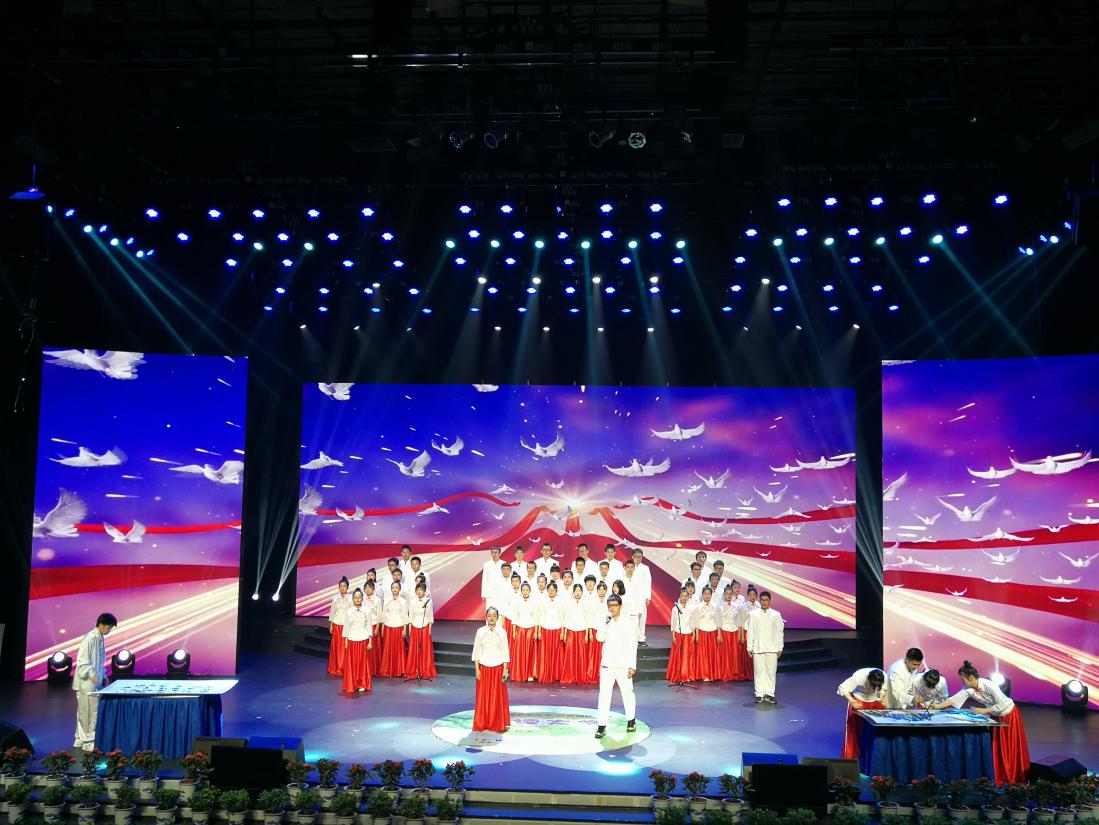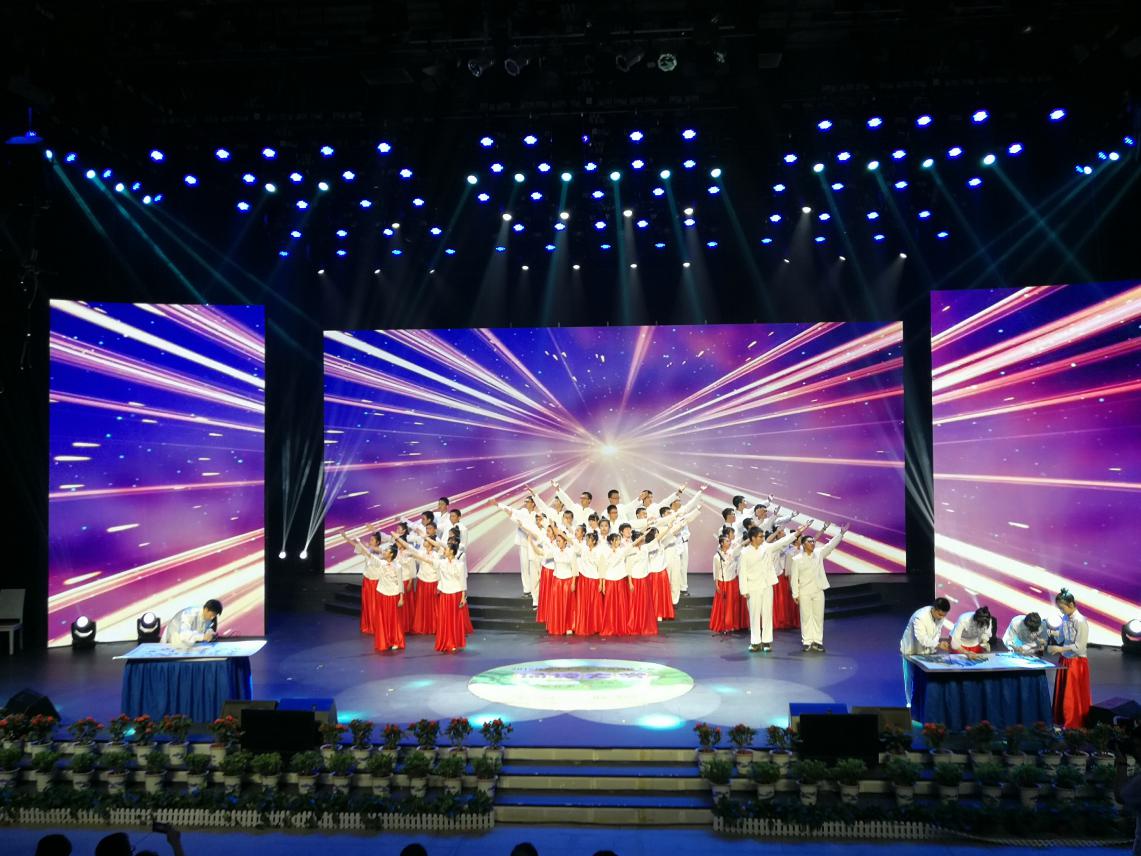 团体赛由廖晨兰老师率1709班全员和1706班的部分同学参加,为达到最佳效果,又不影响日常学习,他们利用有限的课余时间反复练习、多次磨合……4月21日,伴随着背景音乐,南中代表队时而悲苦深情,时而骄傲满怀,将《祖国啊,我亲爱的祖国》和《我骄傲,我是中国人》诠释得恰到好处,淋漓尽致……音乐声停,诵读声断,舞台两侧1706班五个同学的现场书画刚好完成,评委们纷纷亮出最高分,观众们不禁拍手称赞。最终在十八支参赛队伍中南方中学的《传承》以最高分夺得特等奖,惊艳全场。