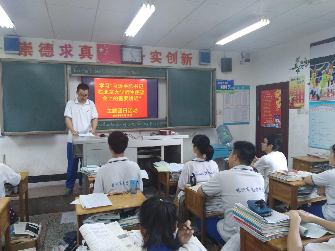5月16日下午,株洲市南方中学校团委在全校开展了一次具有新高度的团日活动。同学们通过观看央视录制的新闻视频,认真学习《习近平总书记在北京大学师生座谈会上重要讲话》和主题发言相结合的方式,加强学生政治素养,提高学生核心竞争力,培养符合时代的有志青年。