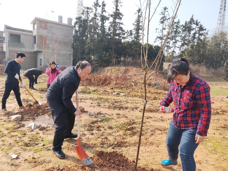 学校蹲点领导叶欣副校长、曾四喜督学,以及支部没有课的党员参与了此次活动,大家一早就自带工具,乘车前往植树地,