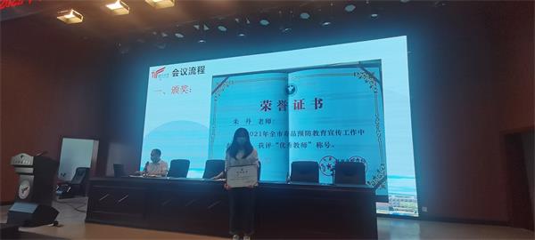 首先,团委李沛婕老师就学校“清谦文化”书画大赛和“建团一百年”庆祝大会活动进行了安排。接着为朱丹老师颁奖,朱老师获评2021年全市毒品预防教育宣传工作优秀教师称号。