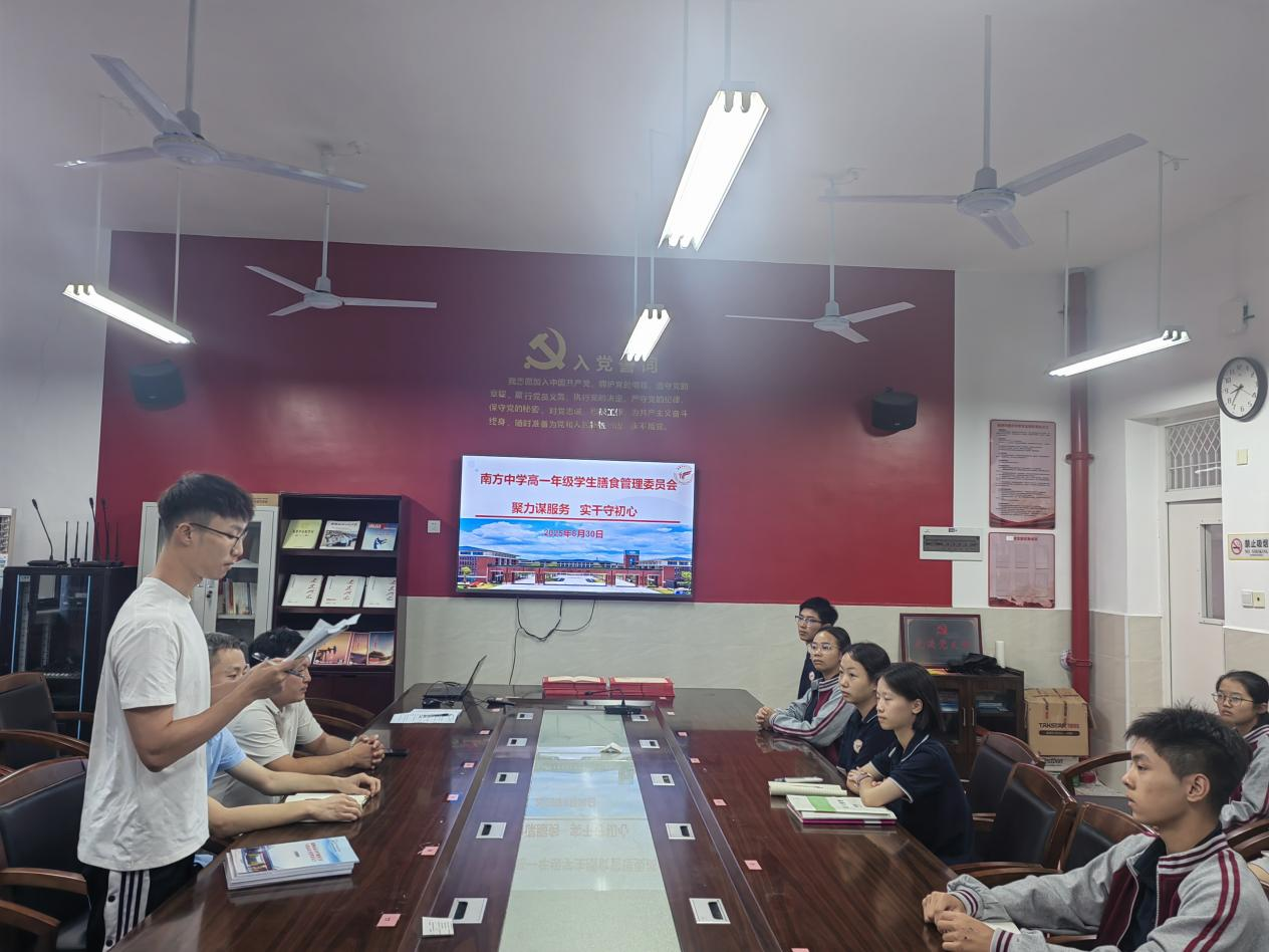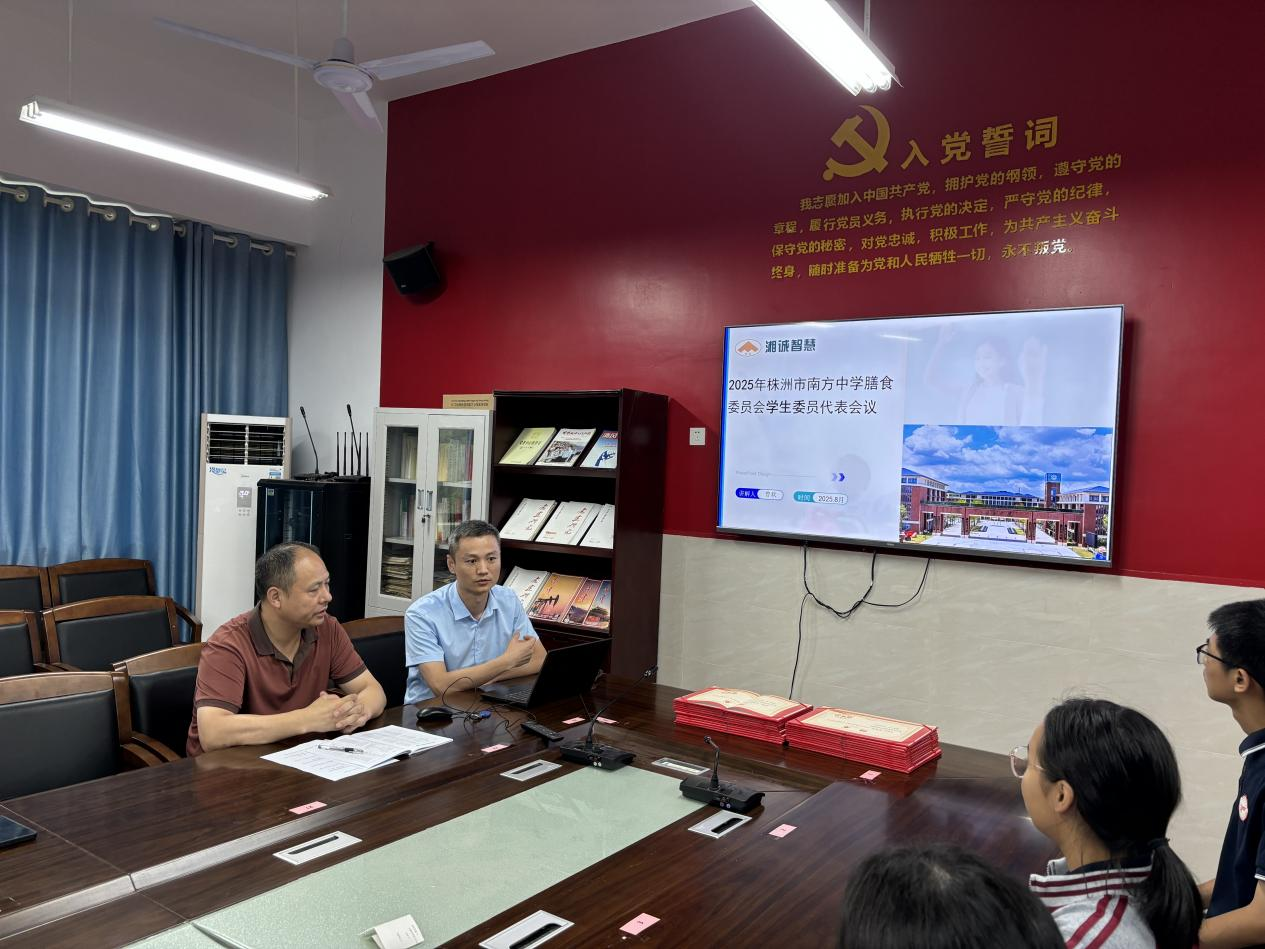 为了进一步提高校园餐食品质,确保学生营养均衡与食品安全,培育学生健康饮食观念,普及营养知识,让健康理念渗透至学生成长的每一个阶段,2025年8月30日下午,株洲市南方中学在创新楼五楼会议室举行了隆重的南方中学膳食学生委员会会议。本次会议由后勤服务部主任谭雄杰主持。