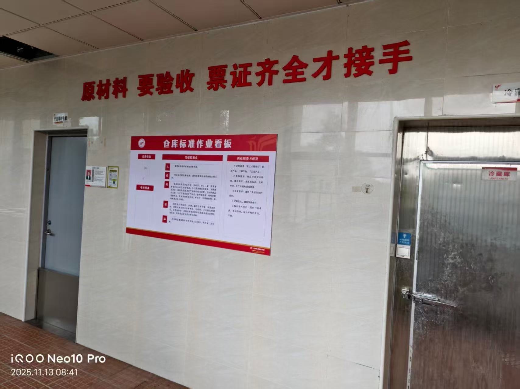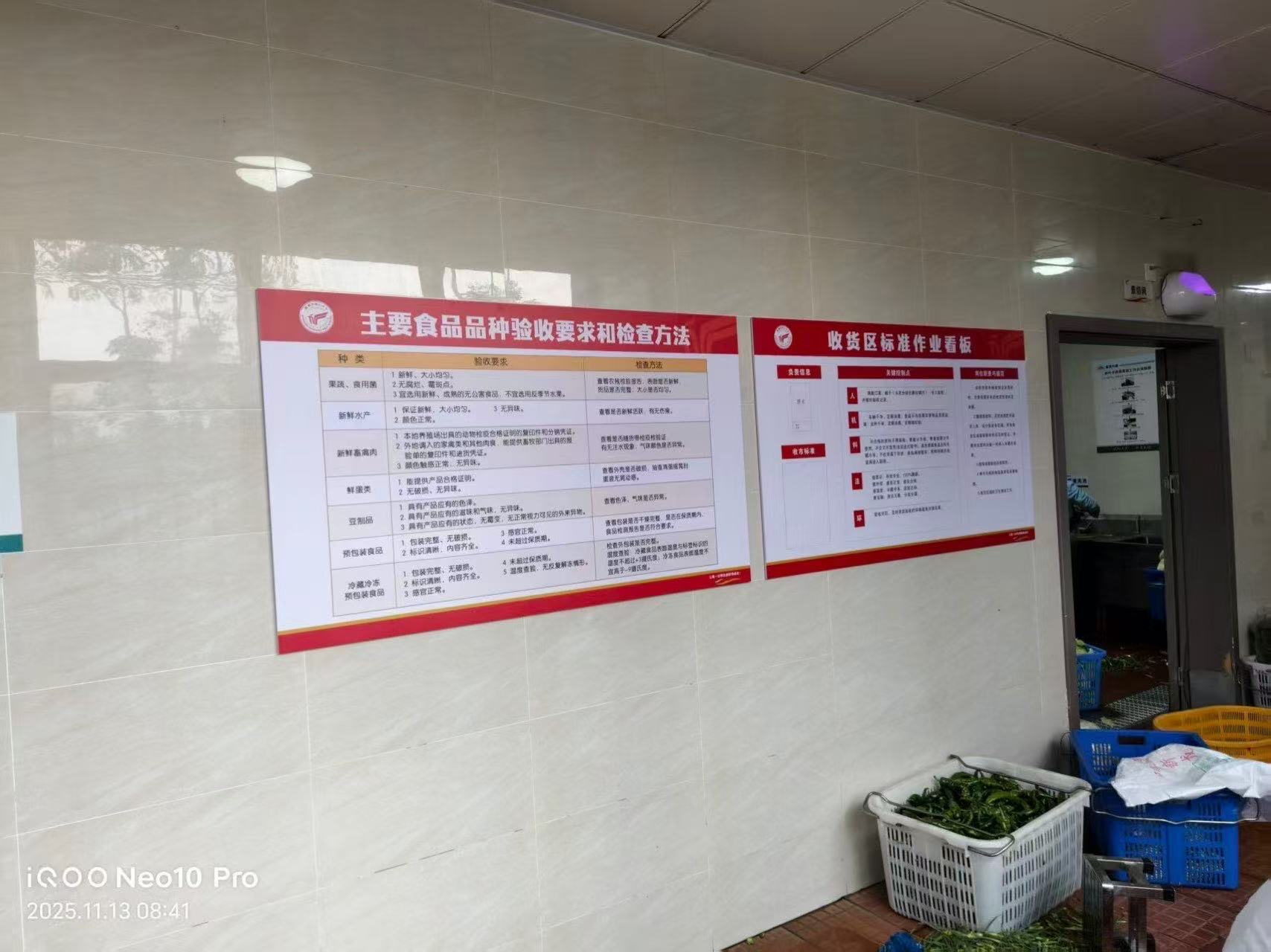 在洗碗区,"一冲二洗三消毒"的流程标语清晰醒目,"专用具、进专池"的提示明确了操作规范。食材验收处张贴着检验标准和方法,仓库收货区"原材料、要验收、票据齐全才接手"的标语朗朗上口,配合标准作业看板,让验收流程一目了然。