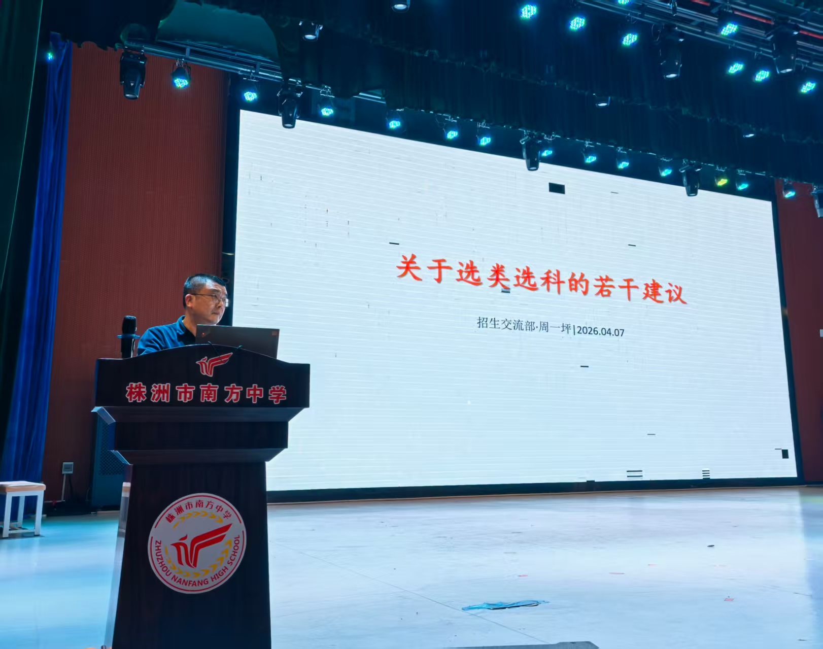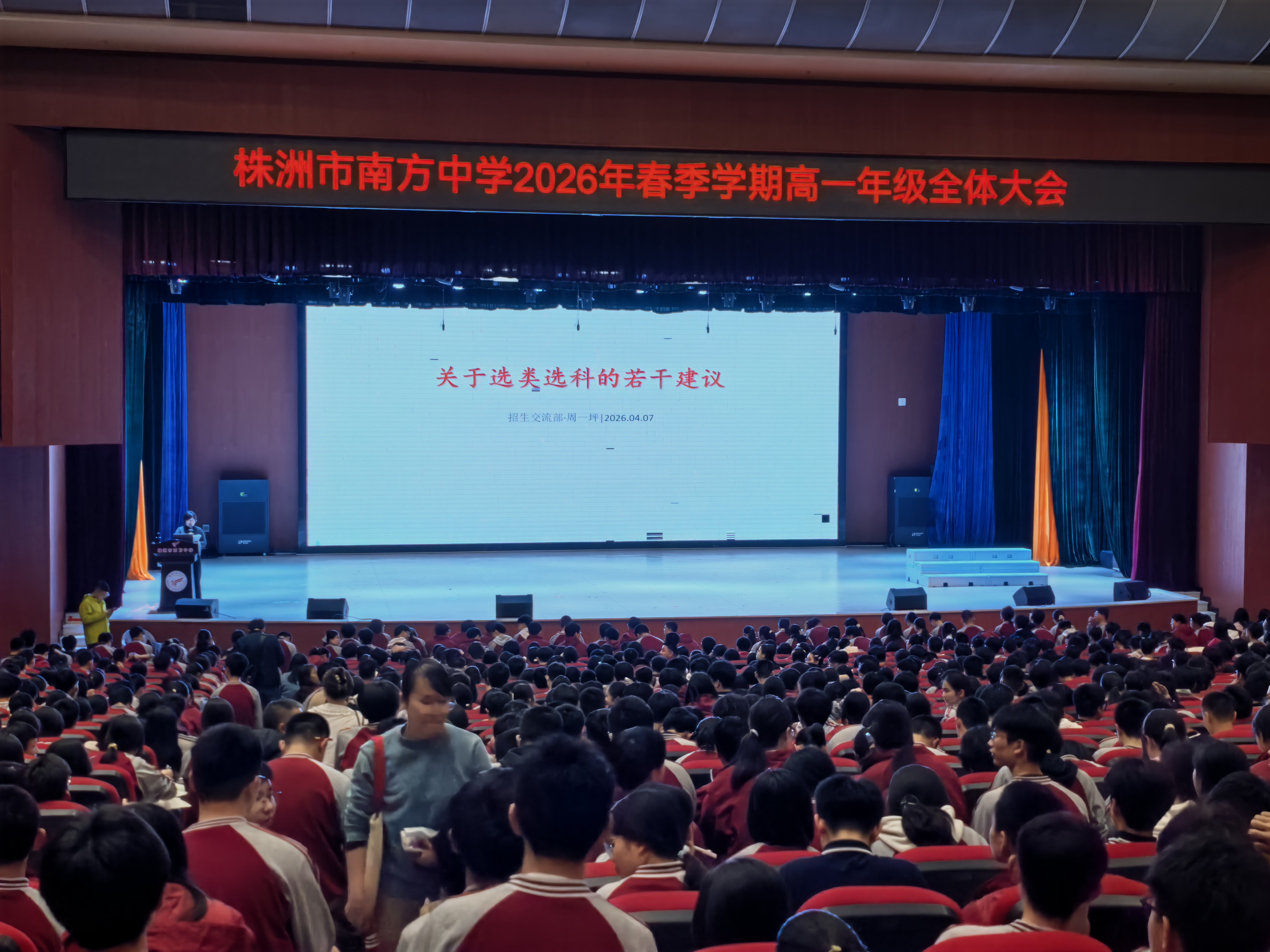 4月7日,株洲市南方中学高一年级全体学生大会在艺术馆召开。学校招生交流部周一坪主任受邀出席会议,围绕“选类选科”主题,为全体高一学子带来了一场干货满满的专题指导。