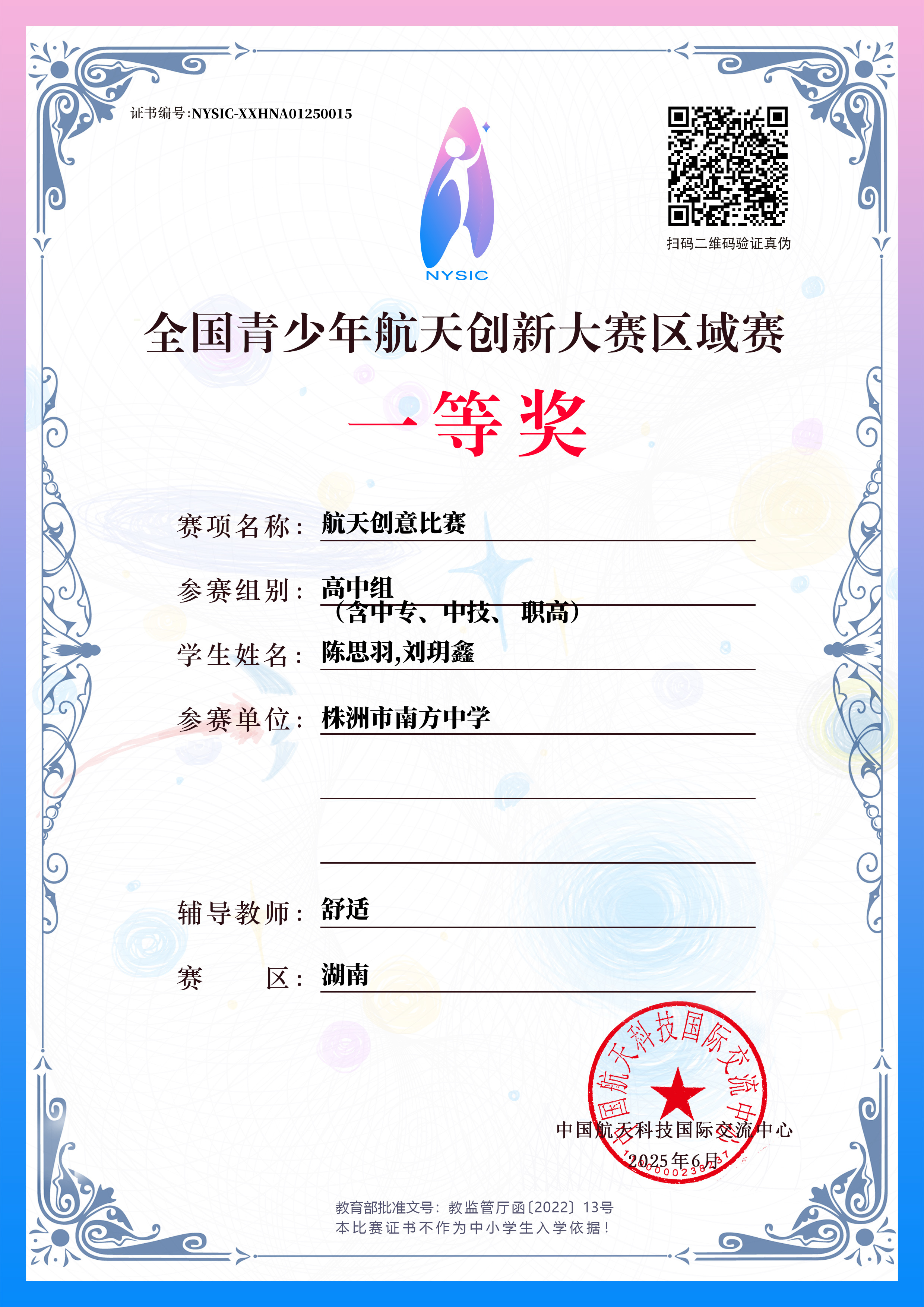 2025年8月4日-7日在海南省文昌市举办的全国青少年航天创新大赛总决赛中,我校2306班陈思羽和刘玥鑫设计的太空清洁按摩椅把中医药和现代科技清洁相结合,荣获航天创意赛高中组三等奖。