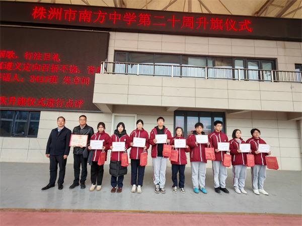 2026年1月12日,株洲市南方中学升旗仪式在学校操场举行并进行了先进典型颁奖仪式。本次颁奖表彰了过去一段时间里为学校争得荣誉的星空合唱团、学校女子足球队和在株洲市读书实践活动中获奖的同学们,旨在树立先进典型,弘扬榜样精神,激励全校师生见贤思齐、奋发进取。