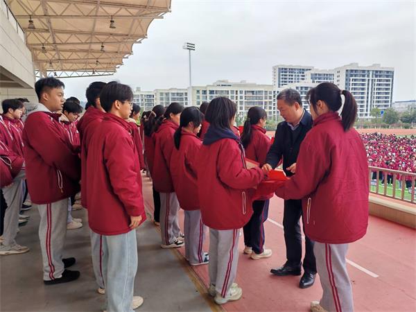 升旗仪式在庄严的国歌声中拉开帷幕,全体师生肃立,齐唱国歌,展现出蓬勃向上的精神风貌。颁奖环节,学校党委书记米仁金为获得湖南省合唱展演金奖的师生、获湖南省足球锦标赛冠军的女子足球队、株洲市读书实践活动获奖的同学颁发荣誉证书。获奖同学手持证书,脸上洋溢着自豪的笑容,台下师生们也用热烈的掌声向他们表达由衷的祝贺。