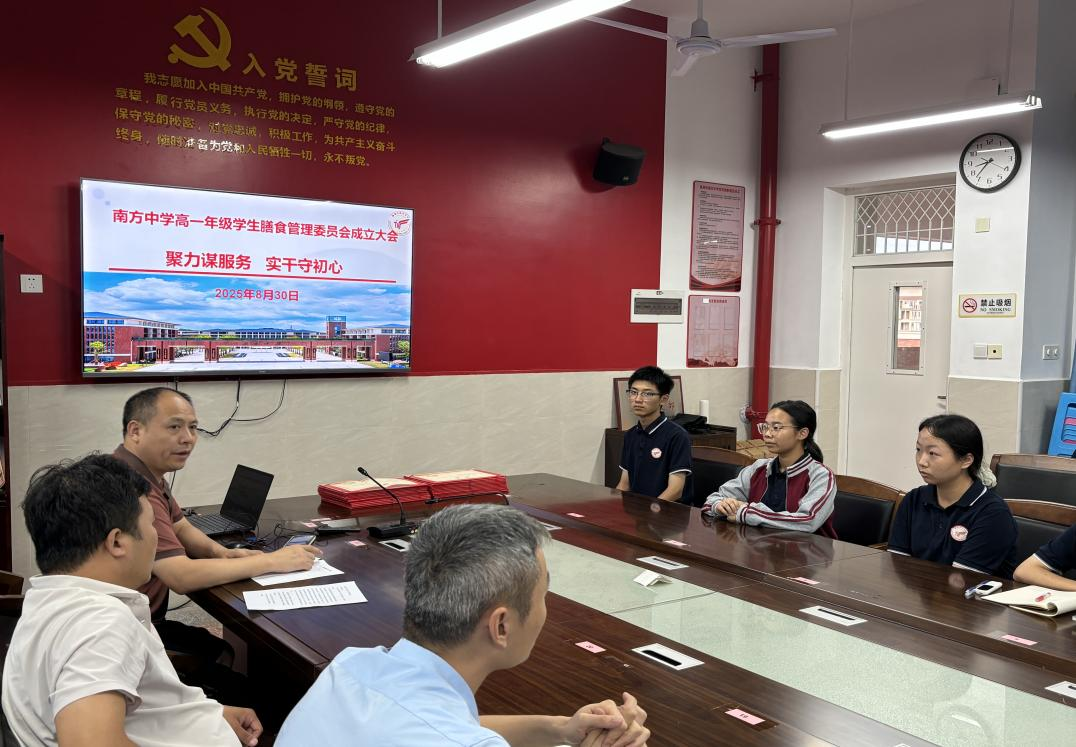 为了进一步提高校园餐食品质,确保学生营养均衡与食品安全,培育学生健康饮食观念,普及营养知识,让健康理念渗透至学生成长的每一个阶段,2025年8月30日下午,株洲市南方中学在创新楼五楼会议室举行了隆重的南方中学膳食学生委员会会议。本次会议由后勤服务部主任谭雄杰主持。