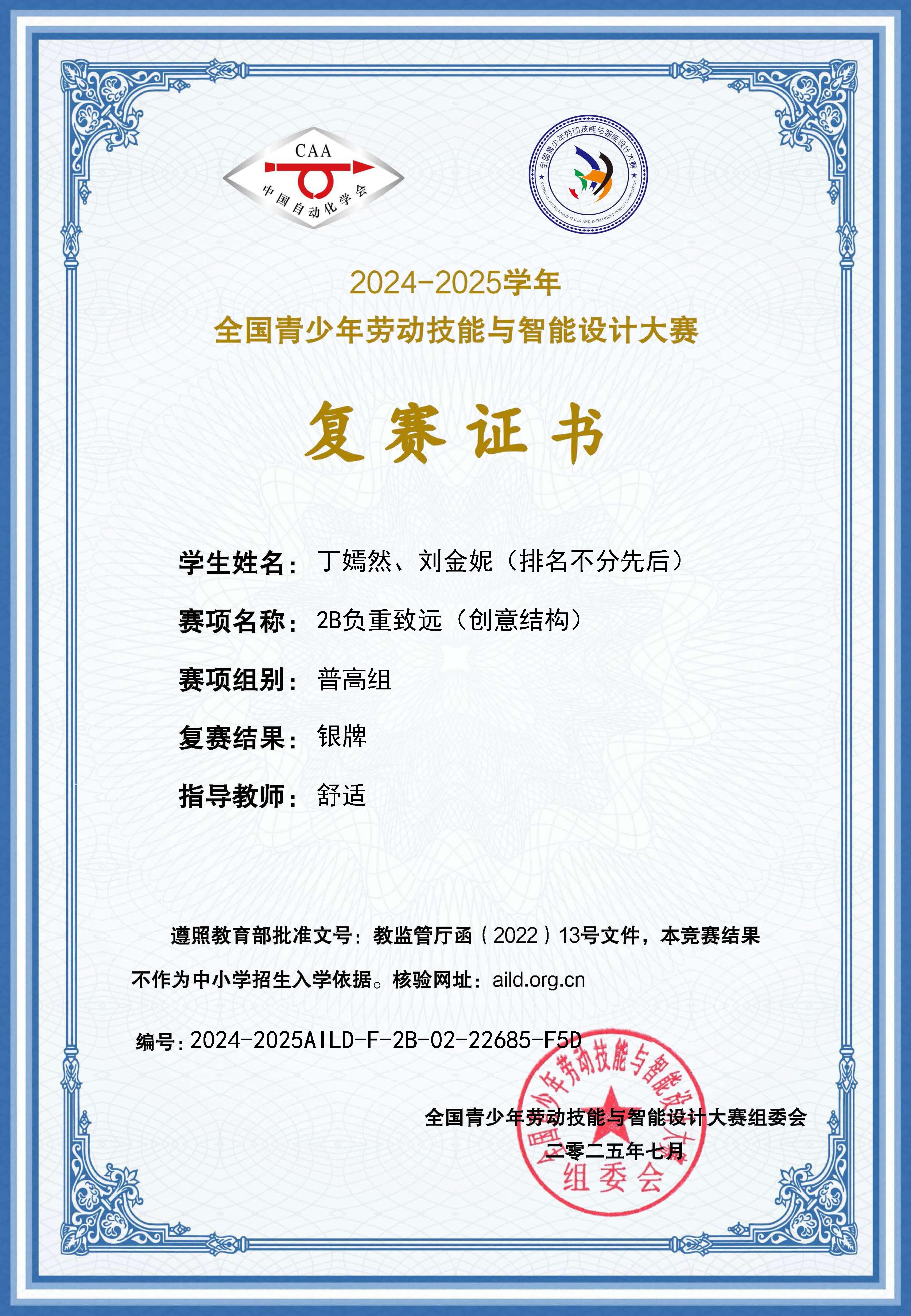 2025年8月14日-30日在山西省怀仁市第三中学举办的全国青少年劳动技能与智能设计大赛(简称AILD)中,2303班陶思骏、2309班张晨宇在负重致远(创意结构)获得全国三等奖。